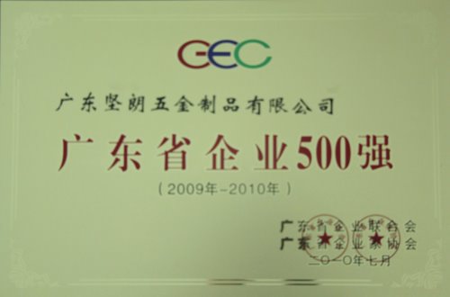 2010 年7月15日廣東省企業(yè)聯(lián)合會(huì)、廣東省企業(yè)家聯(lián)合會(huì)在廣州珠江賓館召開表彰會(huì)議,對(duì)2010年廣東省企業(yè)500強(qiáng)頒發(fā)了榮譽(yù)證書、牌匾。其中廣東堅(jiān)朗以雄厚的實(shí)力作為堅(jiān)實(shí)后盾,獲得廣東企業(yè)500強(qiáng)榮譽(yù)稱號(hào),名列入選廣東企業(yè)500強(qiáng)的東莞企業(yè)第三名。