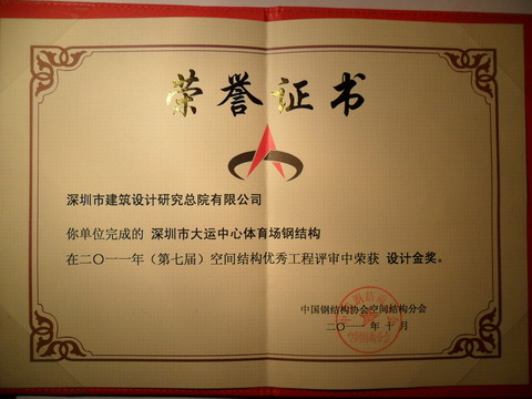 近日,公司“深圳市大運中心體育場鋼結構”設計項目在2010年(第七屆)空間結構優秀工程評審中榮獲獲“設計金獎”。繼今年3月獲得全國鋼結構設計大獎后,該項目再次榮獲全國大獎。